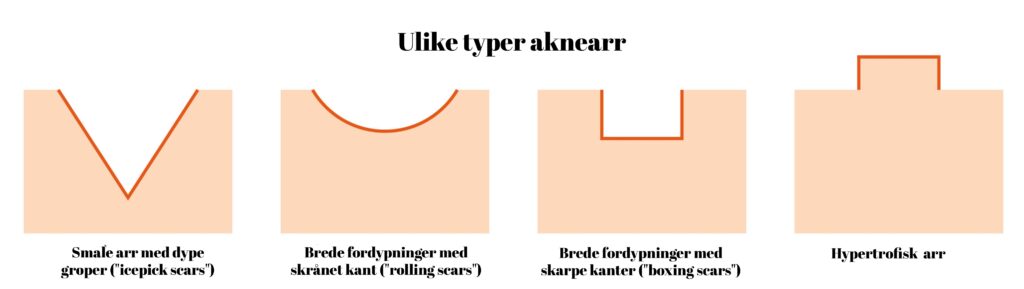 Aknearr klassifiseres på bakgrunn av form, dybde og farge. De vanligste er hypotrofiske arr som kjennetegnes av groper i huden. Det finnes ulike typer av disse: